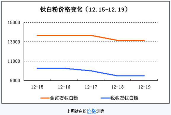 上周国内钛白粉行情继续下跌。市场资源持续供过于求,企业库存成本较高,加之年底资金压力较大,导致市场抛货现象逐渐增多,低价资源逐步占领市场主导地位。目前锐钛型钛白粉成交价最低可至9000元/吨,较上周下跌750元/吨;金红石型钛白粉最低12500元/吨,较上周下跌500元/吨。预计下周钛白粉行情或将继续下调。