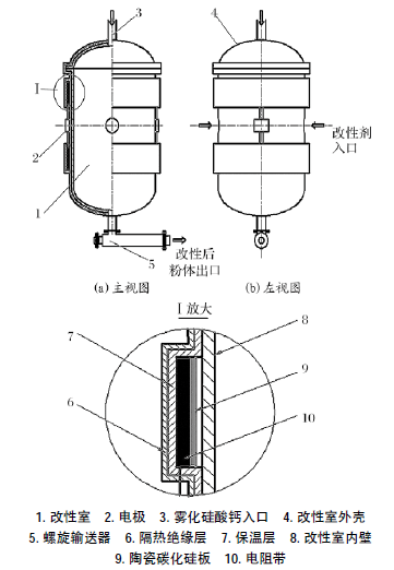 螺旋输送器的设计是考虑到粉体与改性剂进一步包覆,因为进入改性室的部分粉体颗粒与改性剂可能还未发生改性就已经被气流携带进入螺旋输送器输出。改性室的温度由远红外加热,利用不锈钢作电阻带 10,当电流通过时将电能转变为热能,此热能传导给改性室一侧涂有远红外涂料的陶瓷碳化硅板 9,激发远红外涂料中的金属氧化物原子,可提高远红外辐射能,而碳化硅板既以热传导又以远红外辐射形式向改性室加热。为了保持改性室内温度恒定,同时改善因高温导致的炎热的工作环境,在改性室的外侧设有保温层 7 和隔热绝缘层 6。