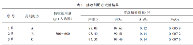捕收剂配方以A 为最佳, 表现为在同等用量的情况下, 浮选精砂的产率较低, 上浮的杂质较多, 捕收力最强。