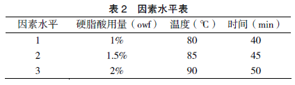 取一定量1500 目重质碳酸钙粉末,加入适量的三级水,将悬浮液倒入三口烧瓶中,用集热式恒温磁力搅拌器进行加热,控制一定的温度,预热一段时间后,边搅拌边加入一定量的硬脂酸,反应一定时间后进行过滤、烘干、研磨得到改性产品。针对改性时间、改性温度和改性剂用量三个因素,采用三因素三水平(表2)的正交试验方法,调整不同的参数进行试验,制备不同改性产品。
