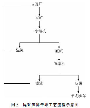 尾矿压滤干堆技术的特点是尾矿浆先经过浓密机脱水,高浓度底流经过滤设备脱水至含水率很低的滤饼,滤饼采用皮带运输机或汽车的运输方式运至尾矿干堆场。其工艺流程如图2。此技术在操作过程中因尾矿脱水设备的差异,涌现出很多新设备与新工艺,例如旋流器在尾矿浓密过程中的应用、陶瓷过滤机在尾矿过滤过程中的应用等。压滤干堆技术于1994年首先在山东平邑归来庄金矿应用,并由国家黄金局作为新技术在全国黄金矿山推广。先后在多个黄金矿山及个别铁矿成功应用,并取得良好经济效益和社会效益。如辽宁省排山楼金矿、北京市的京都全泥氰化炭浆厂、内蒙古撰山子、柴胡栏子金矿、山东金岭铁矿等。