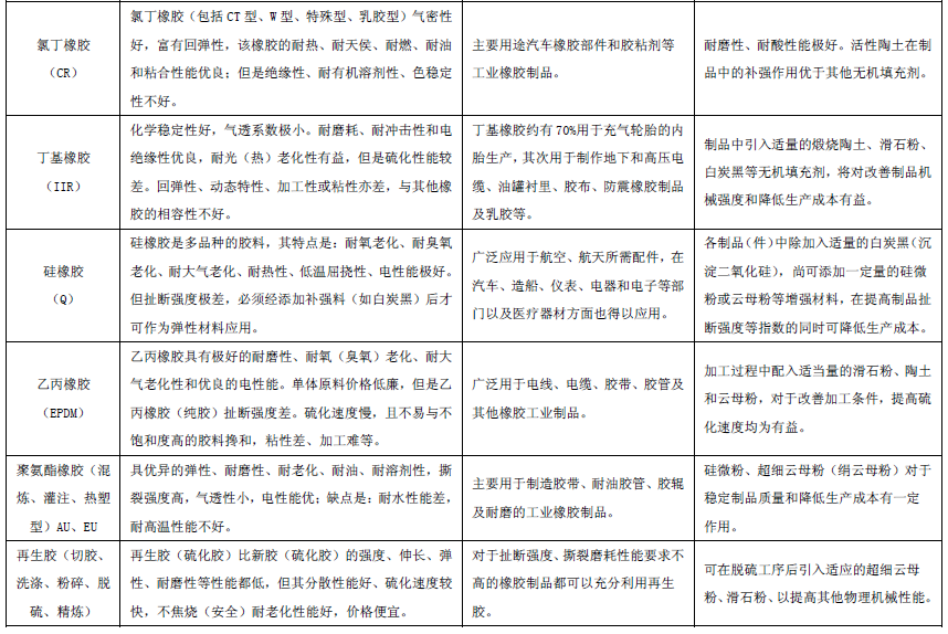 众所周知,炭黑-系石化副产品,因原料及工艺的不同可以分为炉法炭黑、槽法炭黑、热裂法炭黑等品种。炭黑是橡胶制品中最常用和最重要的补强剂,因为炭黑里不仅对橡胶制品有显著的补强作用,而且其具有选择性和针对性。即不同的炭黑品种有不同的补强作用,即使是同一种炭黑对不同的胶料其补强效果也有所不同,这里不作为议题进一步讨论。本文将侧重探讨的是相关功能性非金属矿物材料在橡胶制品中的应用和作用(见表1):
