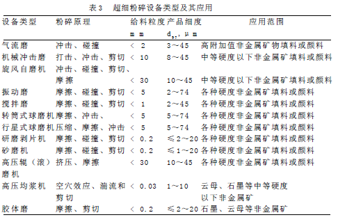 目前非金属矿物粉体加工业中所用的超细粉碎设备主要有气流磨、高速机械冲击磨、搅拌球磨机、研磨剥片机、砂磨机、振动球磨机、旋转筒式球磨机、塔式磨、旋风磨、辊(滚) 磨机、胶体磨等。其中气流磨、高速机械冲击磨、旋风磨、辊(滚)磨机等为干式超细粉碎设备;研磨剥片机、砂磨机、胶体磨等为湿式粉碎机; 搅拌球磨机、振动球磨机、旋转筒式球磨机、塔式磨等既可以用于干式也可以用于湿式超细粉碎。表3 所示为上述各类超细粉碎设备的粉碎原理、给料粒度、产品细度及应用范围。