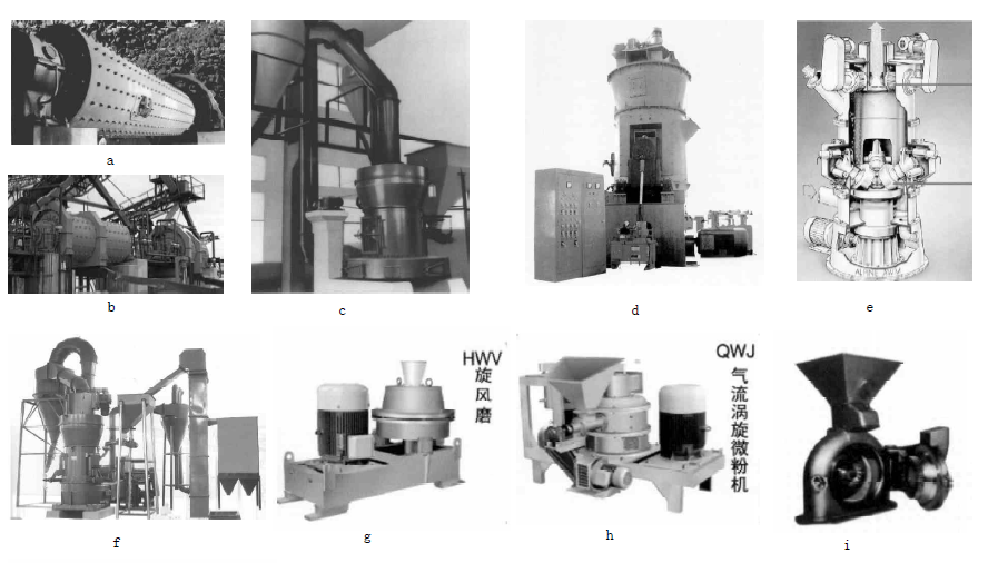 (a)球磨机;(b )棒磨机;(c )悬辊式磨粉机(雷蒙磨)系统;(d )辊磨机外形;(e )辊磨机内部结构;(f )拉杆式磨粉机;(g )H W V旋风磨;(h )Q W J 涡旋磨;(i )销钉磨;(j )C W M 涡流磨;(k )C W J 粉碎机;(l )广义磨;(m )柱磨机;(n )单筒振动磨:(o)双筒振动磨