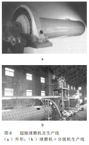 超细振动球磨机有单筒、双筒式等机型(图5 ),已应用于石墨、石英、方解石等非金属矿的细磨和超细磨;湿式振动球磨机的产品细度可达d97=3μm 左右,干式振动磨可达d97=10~20μm左右。用于超细粉碎的旋转筒式球磨机(图6 ),使用球或钢段作研磨介质, 在生产中常与分级机构成闭路粉碎作业, 这种球磨机—分级机干式闭路作业应用于超细重质碳酸钙的生产, 给料粒度≤5m m ,产品细度可在d97= 5~45μm 之间进行调控。