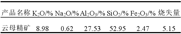 原料为河南洛阳某白云母精矿,密度为2.78g/cm3,化学组分见表1,粒度分布见表2。