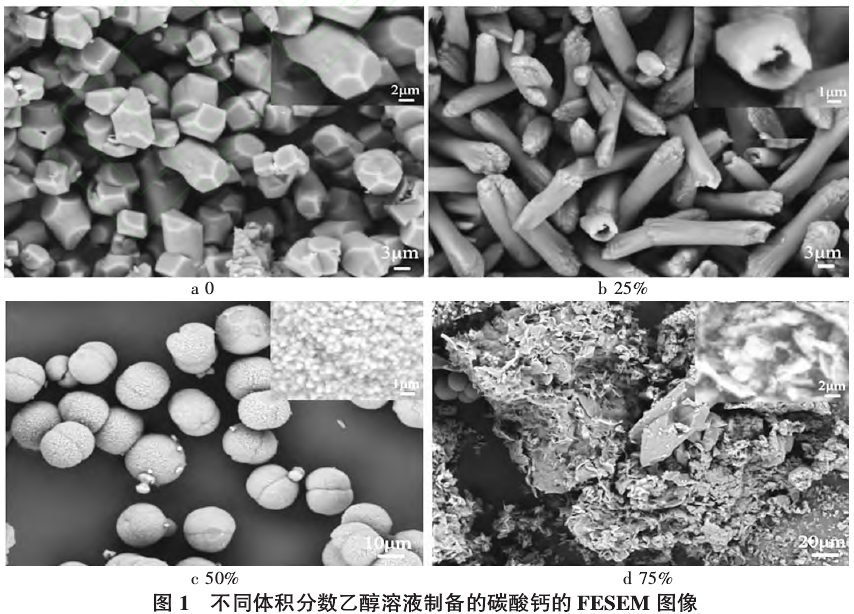 由图1可知,乙醇的体积分数为0(水溶液)时,制备的碳酸钙类似于短柱状,面和棱均清晰可见;