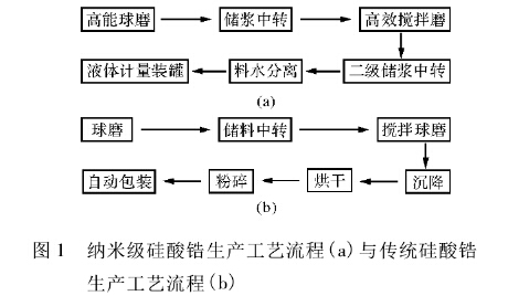贺祥公司纳米级硅酸锆生产线主要设备组成见表1。其工艺流程见图1a,传统工艺流程见图1b。