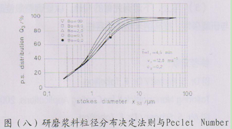 所以当浆料被Pump打入研磨室后,当轴向的运动速度越快,同时于轴向分力越大,且当研磨室内浆料扩散系数越小时,则Peclet值将越大,如此可得到较窄之粒径分布。