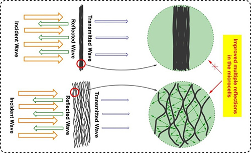 近期,中国科学院宁波材料技术与工程研究所高分子事业部郑文革团队也在石墨烯基电磁屏蔽材料研究方面取得系列进展。首先,考虑到“以石墨烯片层为构筑单元来直接组装构建结构有序的石墨烯基宏观材料有利于最大程度地发挥石墨烯片层优异的导电性能”,研究人员通过“高温石墨化处理氧化石墨烯(GO)薄膜”的方法制备出了具有紧密堆积层状结构的宏观石墨烯薄膜(图1),其中石墨化处理目的是分解GO片层含氧基团并对其结构缺陷进行有效修复,最后所得石墨烯薄膜具有很高的热导率、电导率、电磁屏蔽效能以及很好的柔韧性,厚度仅为~8μm的样品的室温平面热导率高达~1100W/m·K,平面电导率高达~1000S/cm,在X波段上屏蔽效能接近~20dB,相关结果发表在Advanced Functional Materials, 2014, 24:4542。近期,研究人员的研究还表明在石墨烯薄膜中引入适当的微孔结构可以大大增强电磁波在微孔内部的多重反射衰减(图2),从而进一步提升薄膜的电磁屏蔽性能,相关工作发表在Carbon,2016,102:154。