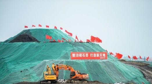 在洛水磷石膏1号堆场整治工程现场,一部分磷石膏作为二次利用建筑原材料被运走,其余全部加固封藏,并恢复堆体的植被和土壤。