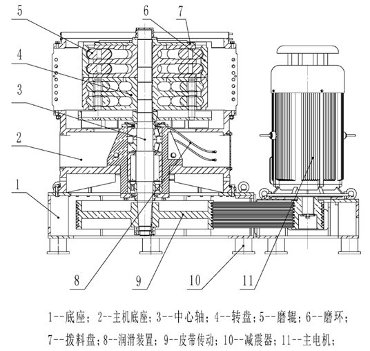环辊磨主要由机体、机座、粉碎装置、分级装置、出料系统、传动装置和电机等组成。