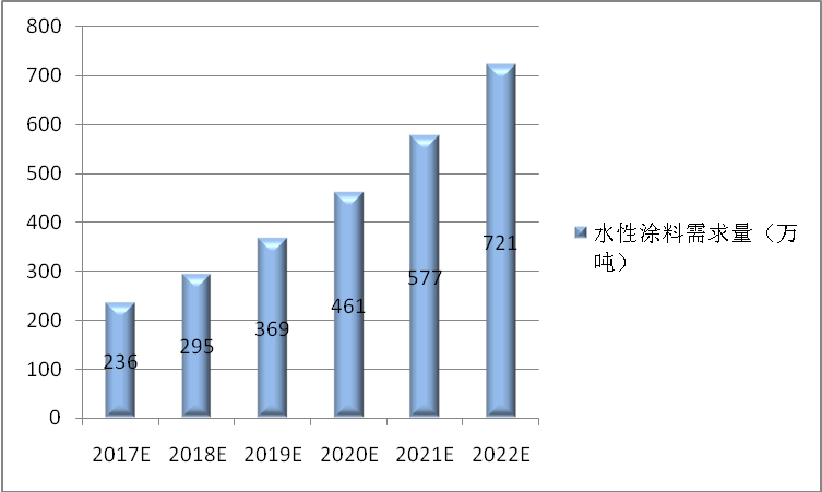 根据前瞻产业研究院发布的《2017-2022年中国水性涂料行业市场需求与投资规划分析报告》:2016年我国水性涂料表观需求量约为189万吨,占涂料行业比重不足10%,随着水性涂料应用范围的扩增,预测五年内我国水性涂料占比可达20%。预测到2022年中国水性涂料市场需求将达到634万吨,复合增速超过20%,行业市场体量客观!