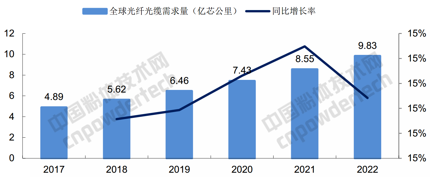 图6 2017-2022 年全球光纤光缆供货量与需求量预测