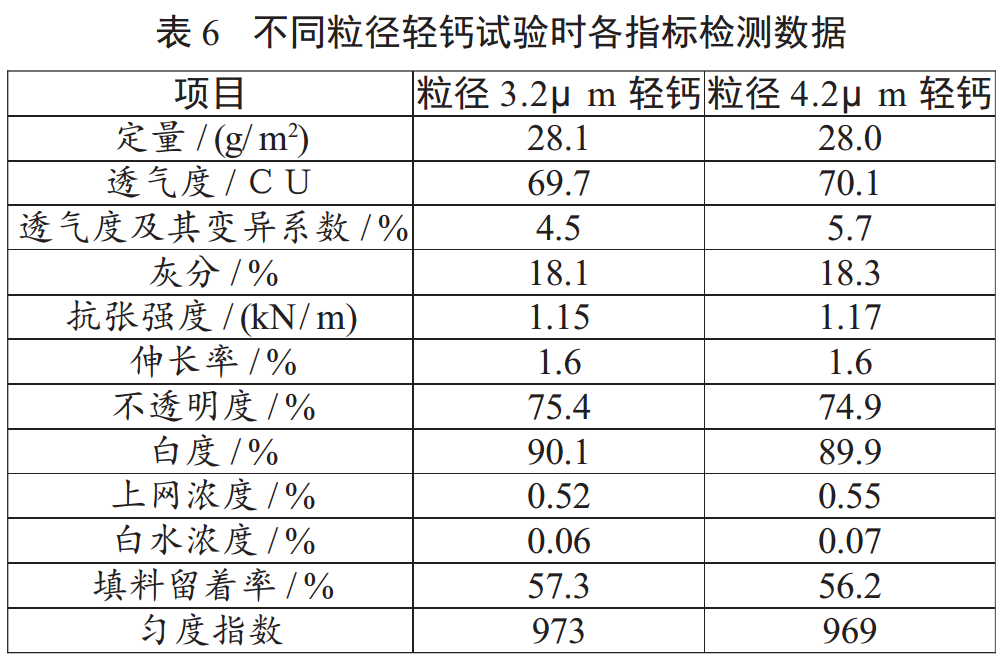 将两组不同粒径的轻钙分别在纸机上进行试验,并取上网浆、白水和成纸进行分析检测,然后进行对比分析。