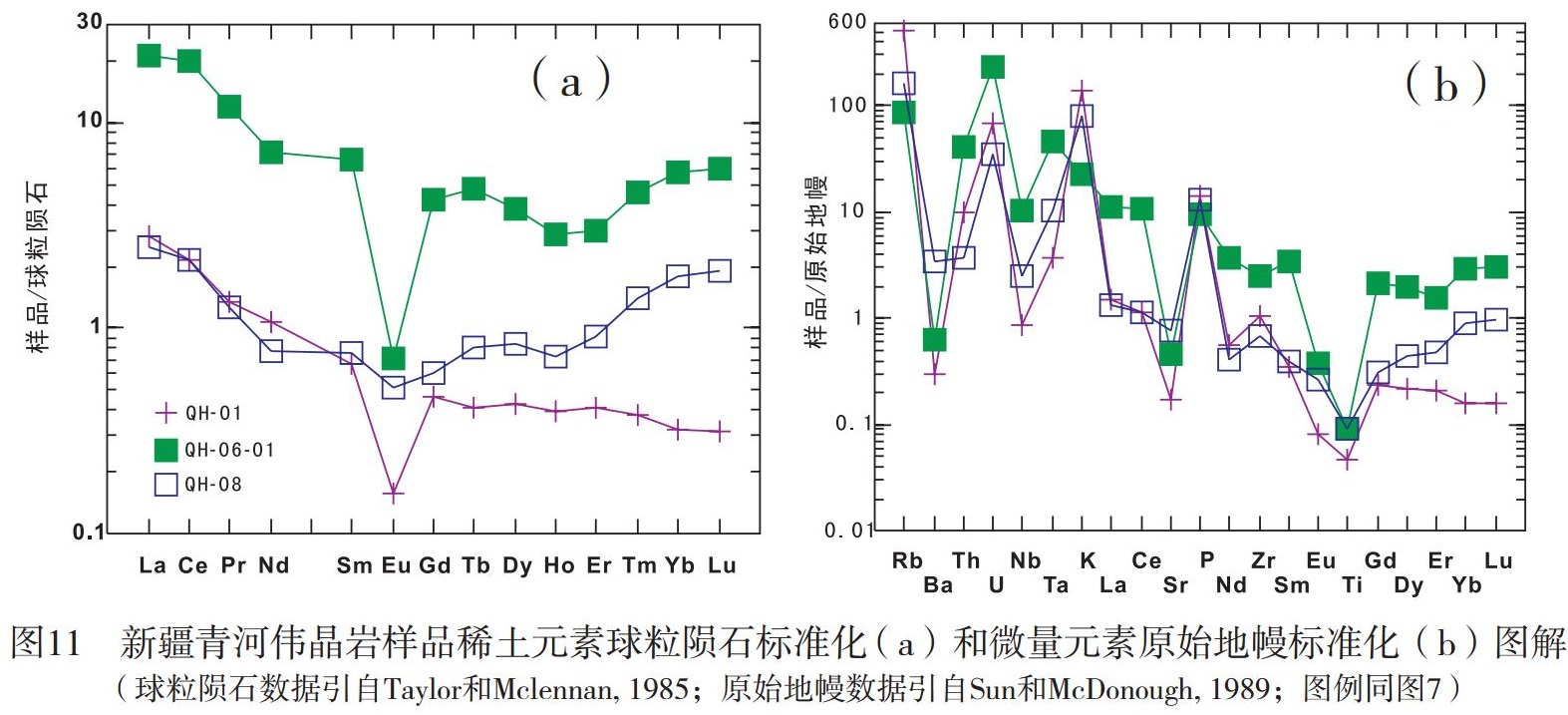 青河地区样品的微量元素差别不是十分明显,在原始地幔不相容元素标准化图解上有相近的变化趋势(图11),其差别主要表现在稀土元素上。QH-01和QH-06-1都属于轻稀土元素富集型,LREE/HREE分别为7.60和6.04;都有明显的Eu负异常,δEu分别为0.21和0.13;但是它们的稀土总量有明显差别,分别为4.73×10-6和40.95×10-6。QH-08号样品与它们相比有明显不同,后者相对富集重稀土元素,LREE/HREE为2.73;明显亏损中稀土元素,Eu负异常不甚明显,只有0.68;稀土总量为5.29×10-6。QH-06-1和QH-08样品表现出明显的M型稀土元素四分组效应,其中第一组La-Ce-Pr-Nd,第三组Gd-Tb-Dy-Ho和第四组Er-Tm-Yb-Lu四分组效应较明显,第二组Pm-Sm-Eu-Gd因Eu亏损而偏离上凸曲线。QH-01样品的四分组效应不明显。