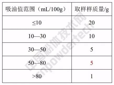 颗粒不像粉体一样可以用调刀翻滚,加了亚麻油或二辛酯(DOP)也黏合不到一起。这里规定:颗粒完全湿润亚麻油或二辛酯(DOP)后,在某恒定时间内亚麻油或二辛酯(DOP)不再外滴。称重计算其吸油值。