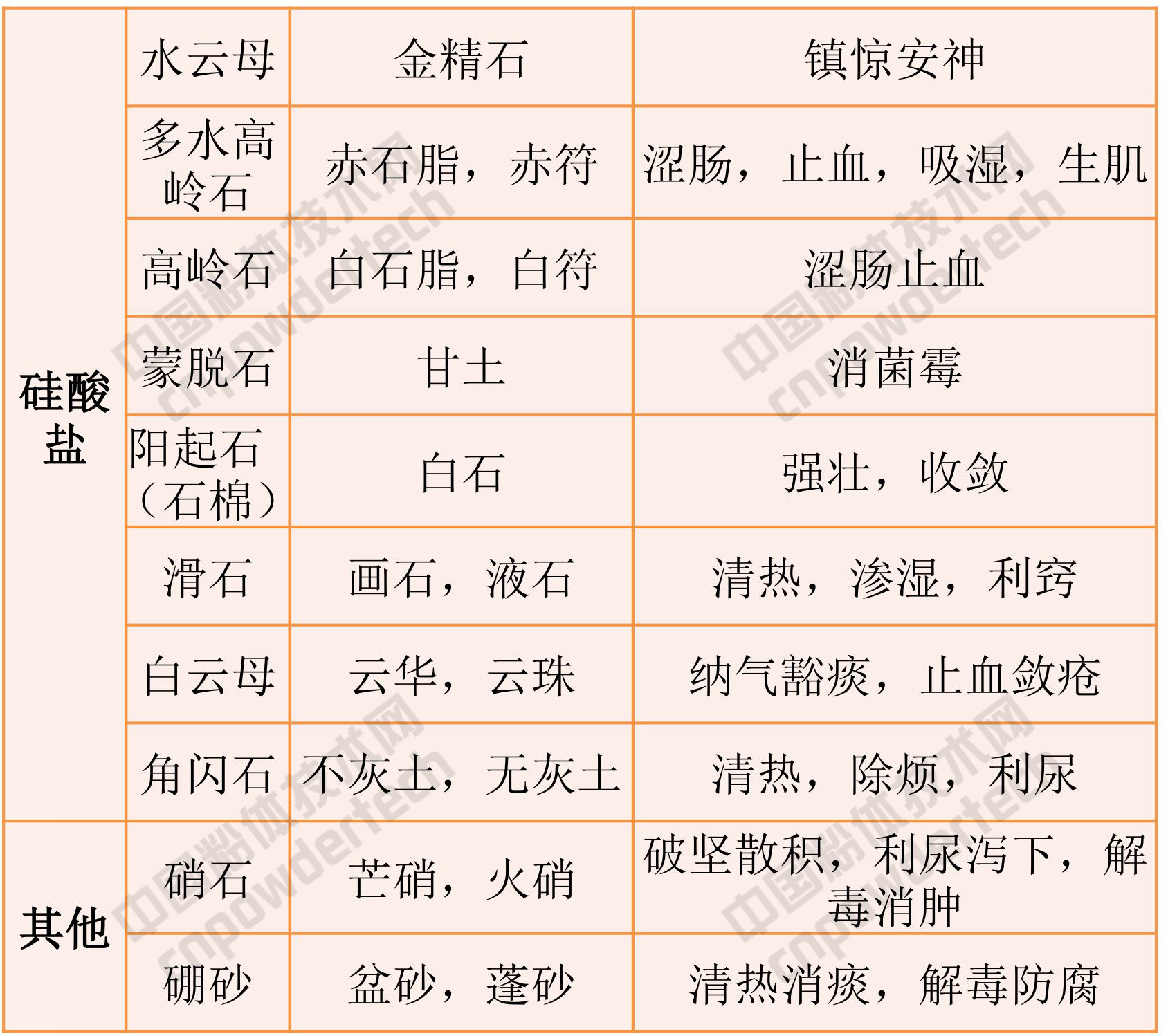 这类矿物在药品生产中起定形(片)作用,如蒙脱石、镁铝硅酸盐等常用作药片生产的成形剂。