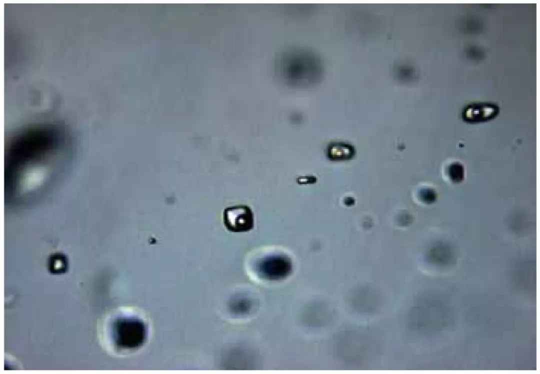 ▲东海变质岩石英中的包裹体(×100):含CO2包裹体,呈群带状分布
