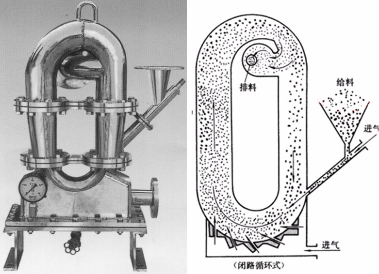 利用高压空气、惰性气体或者过热蒸汽膨胀降温加速来形成高速流场,带动物料粒子在射流流场内互相冲撞、摩擦、剪切来实现物料细化的。常见的有扁平式、流化床逆向喷射式、循环管式、对喷式、靶式等几种机型、数十种规格。