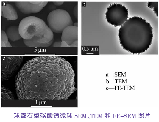 球霰石型碳酸钙在自然界中极少存在,通常球霰石是一个由纳米尺寸的微晶球粒组成的多晶球霰石,而不是方解石和文石那样的单晶体。在实验室合成时,颗粒形貌不仅与晶体结构有关,也与制备条件有很大关系。通常实验制备的球霰石型碳酸钙常以球状聚集体的形式存在,而方解石型碳酸钙常以规则的菱面体形式存在,文石型碳酸钙则易形成针状。此外,球霰石型碳酸钙还具有圆盘形、薄片形、六角形、透镜形等形貌。球形形貌的球霰石型碳酸钙被认为是最有应用前景的一种碳酸钙。