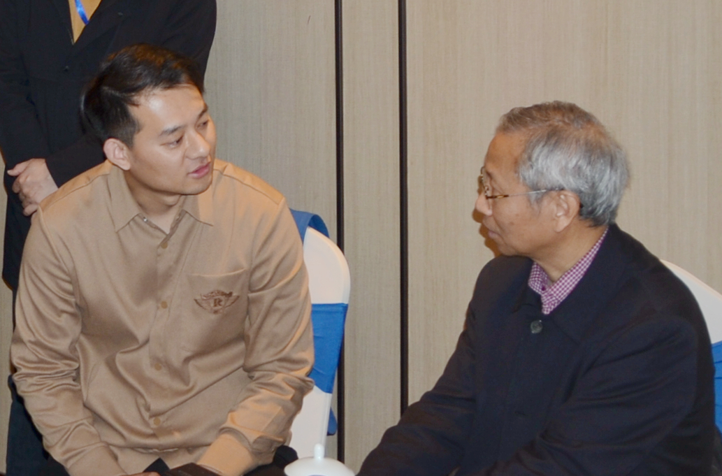 南召县鼎成钙业有限公司总经理张墀(左)与中国矿业大学(北京)郑水林教授现场交流问题
