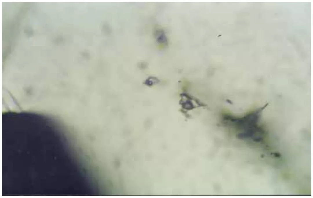 俄罗斯贝加尔湖的粒化石英中的包裹体(×320):包裹体沿裂隙分布
